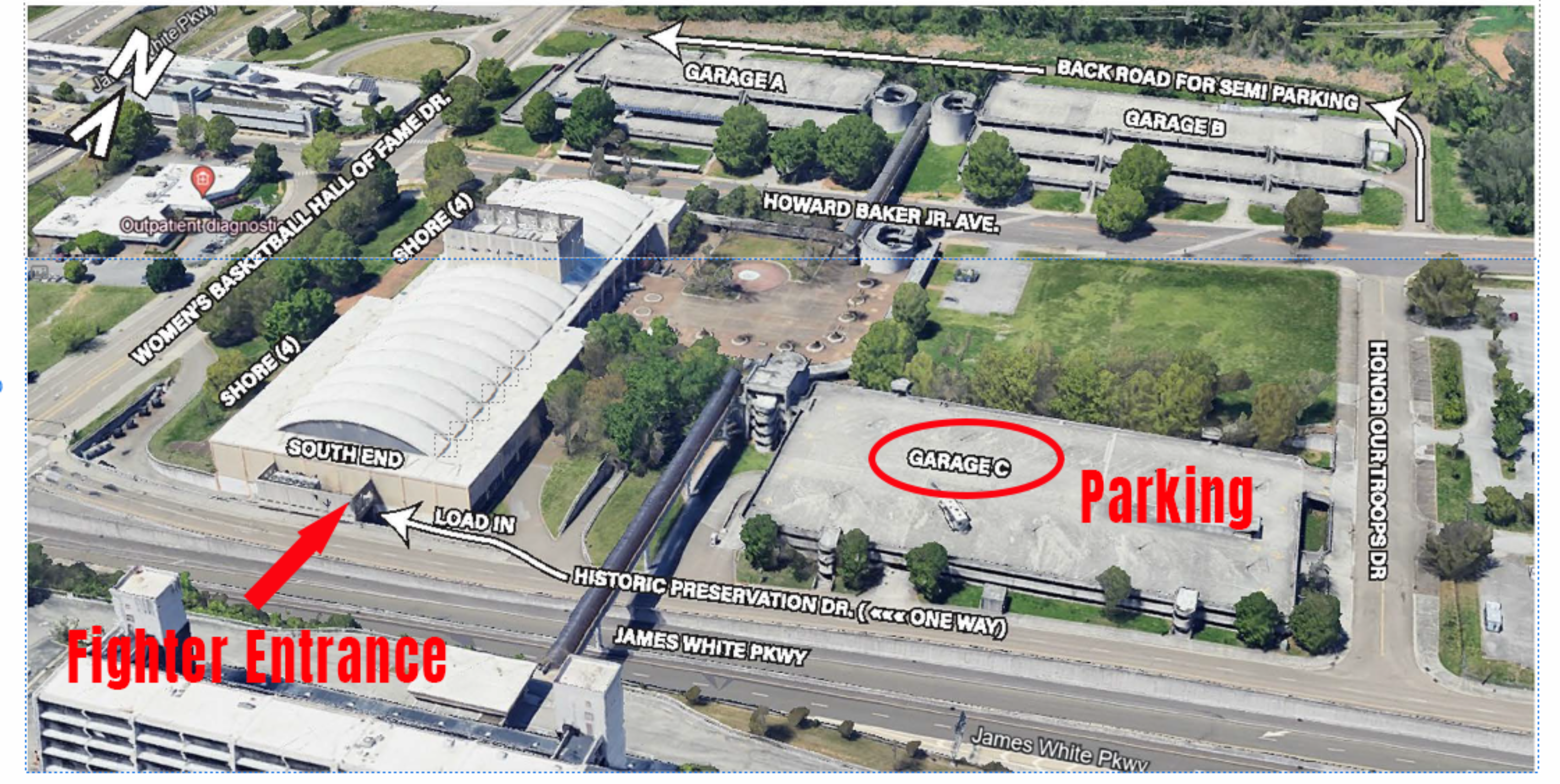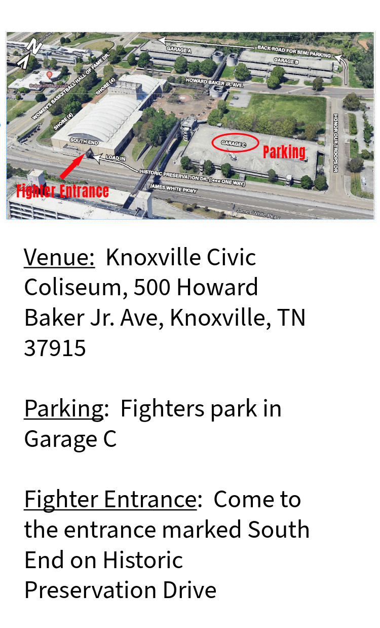 LOCATION: Knoxville Civic Coliseum, 500 Howard Baker Jr. Ave, Knoxville, TN 37915. Fighters enter on South End Entrance (SEE MAP BELOW)